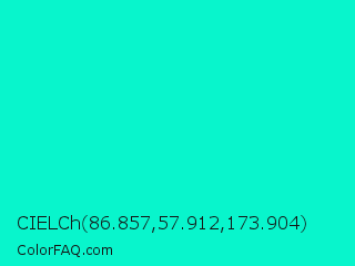 CIELCh 86.857,57.912,173.904 Color is a normal cyan color and the nearest color is Bright Turquoise #08e8de. Hex code #08f5cc and RGB value is rgb(8,245,204). In RGB color space, this color is composed of 3% red, 96% green, 80% blue, In CMYK color space, this color is composed of 97% cyan, 0% magenta, 17% yellow , 4% black , In HSL color space, this color has a hue angle of 170° , 94% saturation and 50% lightness.