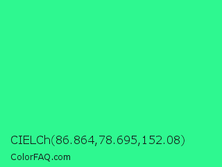 CIELCh 86.864,78.695,152.08 Color is a normal green color and the nearest color is Shamrock #33cc99. Hex code #2ef890 and RGB value is rgb(46,248,144). In RGB color space, this color is composed of 18% red, 97% green, 56% blue, In CMYK color space, this color is composed of 81% cyan, 0% magenta, 42% yellow , 3% black , In HSL color space, this color has a hue angle of 149° , 94% saturation and 58% lightness.