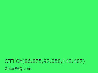 CIELCh 86.875,92.058,143.487 Color is a light green color and the nearest color is UFO Green #3cd070. Hex code #3cf96a and RGB value is rgb(60,249,106). In RGB color space, this color is composed of 24% red, 98% green, 42% blue, In CMYK color space, this color is composed of 76% cyan, 0% magenta, 57% yellow , 2% black , In HSL color space, this color has a hue angle of 135° , 94% saturation and 61% lightness.