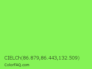 CIELCh 86.879,86.443,132.509 Color is a light green color and the nearest color is Kiwi #8ee53f. Hex code #85f356 and RGB value is rgb(133,243,86). In RGB color space, this color is composed of 52% red, 95% green, 34% blue, In CMYK color space, this color is composed of 45% cyan, 0% magenta, 65% yellow , 5% black , In HSL color space, this color has a hue angle of 102° , 87% saturation and 65% lightness.