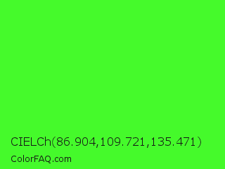 CIELCh 86.904,109.721,135.471 Color is a normal green color and the nearest color is Neon Green #39ff14. Hex code #45fa2b and RGB value is rgb(69,250,43). In RGB color space, this color is composed of 27% red, 98% green, 17% blue, In CMYK color space, this color is composed of 72% cyan, 0% magenta, 83% yellow , 2% black , In HSL color space, this color has a hue angle of 112° , 95% saturation and 57% lightness.