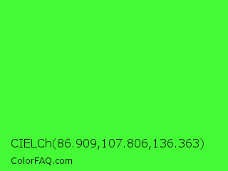 CIELCh 86.909,107.806,136.363 Color is a normal green color and the nearest color is Neon Green #39ff14. Hex code #43fa35 and RGB value is rgb(67,250,53). In RGB color space, this color is composed of 26% red, 98% green, 21% blue, In CMYK color space, this color is composed of 73% cyan, 0% magenta, 79% yellow , 2% black , In HSL color space, this color has a hue angle of 116° , 95% saturation and 59% lightness.