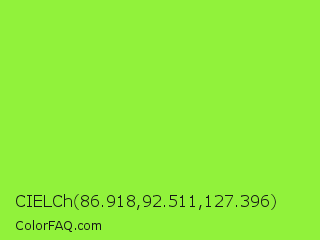 CIELCh 86.918,92.511,127.396 Color is a normal green color and the nearest color is Kiwi #8ee53f. Hex code #91f23b and RGB value is rgb(145,242,59). In RGB color space, this color is composed of 57% red, 95% green, 23% blue, In CMYK color space, this color is composed of 40% cyan, 0% magenta, 76% yellow , 5% black , In HSL color space, this color has a hue angle of 92° , 88% saturation and 59% lightness.