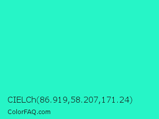CIELCh 86.919,58.207,171.24 Color is a normal cyan color and the nearest color is Turquoise PWG #30d5c8. Hex code #26f5c7 and RGB value is rgb(38,245,199). In RGB color space, this color is composed of 15% red, 96% green, 78% blue, In CMYK color space, this color is composed of 84% cyan, 0% magenta, 19% yellow , 4% black , In HSL color space, this color has a hue angle of 167° , 91% saturation and 55% lightness.