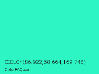 CIELCh 86.922,58.664,169.748 Color is a normal cyan color and the nearest color is Turquoise #40e0d0. Hex code #2df5c4 and RGB value is rgb(45,245,196). In RGB color space, this color is composed of 18% red, 96% green, 77% blue, In CMYK color space, this color is composed of 82% cyan, 0% magenta, 20% yellow , 4% black , In HSL color space, this color has a hue angle of 165° , 91% saturation and 57% lightness.