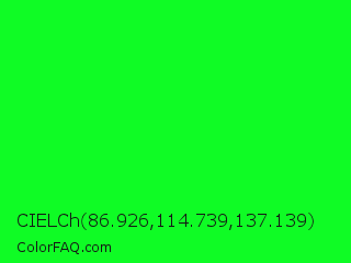 CIELCh 86.926,114.739,137.139 Color is a normal green color and the nearest color is Green #00ff00. Hex code #0ffc25 and RGB value is rgb(15,252,37). In RGB color space, this color is composed of 6% red, 99% green, 15% blue, In CMYK color space, this color is composed of 94% cyan, 0% magenta, 85% yellow , 1% black , In HSL color space, this color has a hue angle of 126° , 98% saturation and 52% lightness.