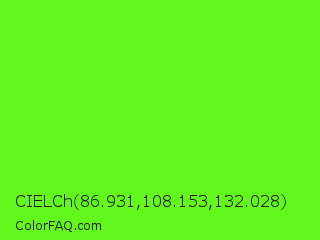 CIELCh 86.931,108.153,132.028 Color is a normal green color and the nearest color is Bright Green #66ff00. Hex code #63f81b and RGB value is rgb(99,248,27). In RGB color space, this color is composed of 39% red, 97% green, 11% blue, In CMYK color space, this color is composed of 60% cyan, 0% magenta, 89% yellow , 3% black , In HSL color space, this color has a hue angle of 100° , 94% saturation and 54% lightness.