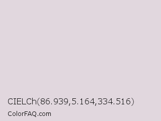 CIELCh 86.939,5.164,334.516 Color is a very light magenta color and the nearest color is Gainsboro #dcdcdc. Hex code #e1d7de and RGB value is rgb(225,215,222). In RGB color space, this color is composed of 88% red, 84% green, 87% blue, In CMYK color space, this color is composed of 0% cyan, 4% magenta, 1% yellow , 12% black , In HSL color space, this color has a hue angle of 318° , 14% saturation and 86% lightness.