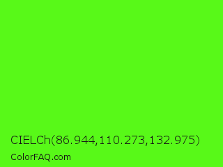 CIELCh 86.944,110.273,132.975 Color is a normal green color and the nearest color is Bright Green #66ff00. Hex code #58f918 and RGB value is rgb(88,249,24). In RGB color space, this color is composed of 35% red, 98% green, 9% blue, In CMYK color space, this color is composed of 65% cyan, 0% magenta, 90% yellow , 2% black , In HSL color space, this color has a hue angle of 103° , 95% saturation and 54% lightness.