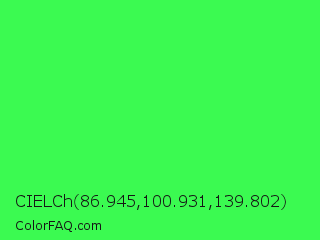 CIELCh 86.945,100.931,139.802 Color is a light green color and the nearest color is Screamin Green #66ff66. Hex code #3bfa51 and RGB value is rgb(59,250,81). In RGB color space, this color is composed of 23% red, 98% green, 32% blue, In CMYK color space, this color is composed of 76% cyan, 0% magenta, 68% yellow , 2% black , In HSL color space, this color has a hue angle of 127° , 95% saturation and 61% lightness.