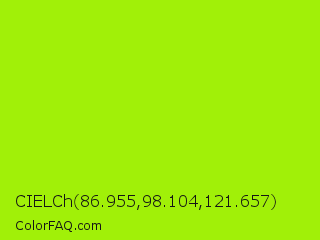 CIELCh 86.955,98.104,121.657 Color is a normal green color and the nearest color is Spring Bud #a7fc00. Hex code #a1f008 and RGB value is rgb(161,240,8). In RGB color space, this color is composed of 63% red, 94% green, 3% blue, In CMYK color space, this color is composed of 33% cyan, 0% magenta, 97% yellow , 6% black , In HSL color space, this color has a hue angle of 80° , 94% saturation and 49% lightness.