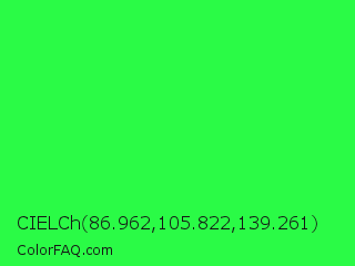 CIELCh 86.962,105.822,139.261 Color is a normal green color and the nearest color is Malachite #0bda51. Hex code #2afb46 and RGB value is rgb(42,251,70). In RGB color space, this color is composed of 16% red, 98% green, 27% blue, In CMYK color space, this color is composed of 83% cyan, 0% magenta, 72% yellow , 2% black , In HSL color space, this color has a hue angle of 128° , 96% saturation and 57% lightness.