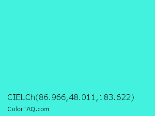 CIELCh 86.966,48.011,183.622 Color is a normal cyan color and the nearest color is Turquoise #40e0d0. Hex code #42f2de and RGB value is rgb(66,242,222). In RGB color space, this color is composed of 26% red, 95% green, 87% blue, In CMYK color space, this color is composed of 73% cyan, 0% magenta, 8% yellow , 5% black , In HSL color space, this color has a hue angle of 173° , 87% saturation and 60% lightness.