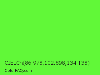CIELCh 86.978,102.898,134.138 Color is a normal green color and the nearest color is Spring Frost #87ff2a. Hex code #61f838 and RGB value is rgb(97,248,56). In RGB color space, this color is composed of 38% red, 97% green, 22% blue, In CMYK color space, this color is composed of 61% cyan, 0% magenta, 77% yellow , 3% black , In HSL color space, this color has a hue angle of 107° , 93% saturation and 60% lightness.