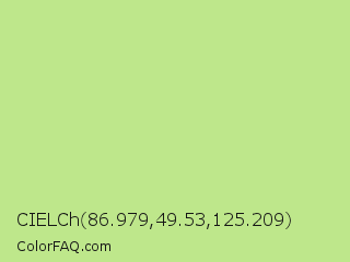 CIELCh 86.979,49.53,125.209 Color is a light green color and the nearest color is Medium Spring Bud #c9dc87. Hex code #bee78b and RGB value is rgb(190,231,139). In RGB color space, this color is composed of 75% red, 91% green, 55% blue, In CMYK color space, this color is composed of 18% cyan, 0% magenta, 40% yellow , 9% black , In HSL color space, this color has a hue angle of 87° , 66% saturation and 73% lightness.