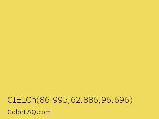 CIELCh 86.995,62.886,96.696 Color is a light yellow color and the nearest color is Energy Yellow #f8dd5c. Hex code #f0db5e and RGB value is rgb(240,219,94). In RGB color space, this color is composed of 94% red, 86% green, 37% blue, In CMYK color space, this color is composed of 0% cyan, 9% magenta, 61% yellow , 6% black , In HSL color space, this color has a hue angle of 51° , 83% saturation and 65% lightness.