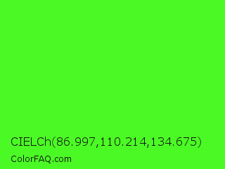 CIELCh 86.997,110.214,134.675 Color is a normal green color and the nearest color is Neon Green #39ff14. Hex code #4bfa25 and RGB value is rgb(75,250,37). In RGB color space, this color is composed of 29% red, 98% green, 15% blue, In CMYK color space, this color is composed of 70% cyan, 0% magenta, 85% yellow , 2% black , In HSL color space, this color has a hue angle of 109° , 96% saturation and 56% lightness.