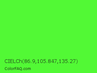 CIELCh 86.9,105.847,135.27 Color is a normal green color and the nearest color is Neon Green #39ff14. Hex code #52f935 and RGB value is rgb(82,249,53). In RGB color space, this color is composed of 32% red, 98% green, 21% blue, In CMYK color space, this color is composed of 67% cyan, 0% magenta, 79% yellow , 2% black , In HSL color space, this color has a hue angle of 111° , 94% saturation and 59% lightness.