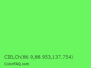 CIELCh 86.9,88.953,137.754 Color is a light green color and the nearest color is Screamin Green #66ff66. Hex code #6af65f and RGB value is rgb(106,246,95). In RGB color space, this color is composed of 42% red, 96% green, 37% blue, In CMYK color space, this color is composed of 57% cyan, 0% magenta, 61% yellow , 4% black , In HSL color space, this color has a hue angle of 116° , 89% saturation and 67% lightness.