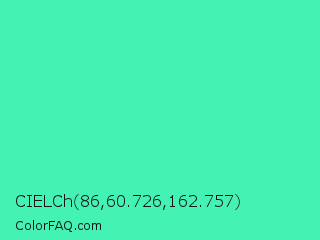CIELCh 86,60.726,162.757 Color is a light green color and the nearest color is Eucalyptus #44d7a8. Hex code #44f2b3 and RGB value is rgb(68,242,179). In RGB color space, this color is composed of 27% red, 95% green, 70% blue, In CMYK color space, this color is composed of 72% cyan, 0% magenta, 26% yellow , 5% black , In HSL color space, this color has a hue angle of 158° , 87% saturation and 61% lightness.