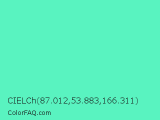 CIELCh 87.012,53.883,166.311 Color is a light green color and the nearest color is Medium Aquamarine #66ddaa. Hex code #59f3c0 and RGB value is rgb(89,243,192). In RGB color space, this color is composed of 35% red, 95% green, 75% blue, In CMYK color space, this color is composed of 63% cyan, 0% magenta, 21% yellow , 5% black , In HSL color space, this color has a hue angle of 160° , 87% saturation and 65% lightness.