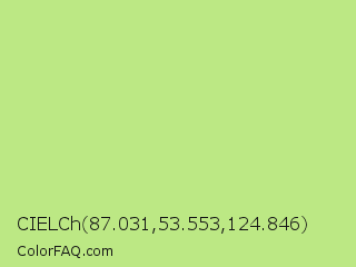 CIELCh 87.031,53.553,124.846 Color is a light green color and the nearest color is Sulu #c1f07c. Hex code #bce884 and RGB value is rgb(188,232,132). In RGB color space, this color is composed of 74% red, 91% green, 52% blue, In CMYK color space, this color is composed of 19% cyan, 0% magenta, 43% yellow , 9% black , In HSL color space, this color has a hue angle of 86° , 68% saturation and 71% lightness.
