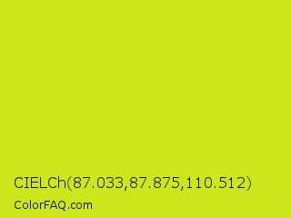 CIELCh 87.033,87.875,110.512 Color is a normal yellow color and the nearest color is Las Palmas #c6e610. Hex code #cce71c and RGB value is rgb(204,231,28). In RGB color space, this color is composed of 80% red, 91% green, 11% blue, In CMYK color space, this color is composed of 12% cyan, 0% magenta, 88% yellow , 9% black , In HSL color space, this color has a hue angle of 68° , 81% saturation and 51% lightness.