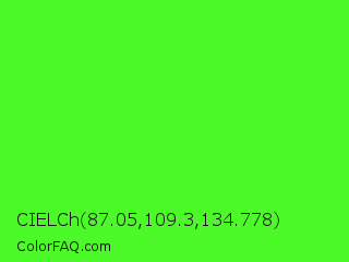 CIELCh 87.05,109.3,134.778 Color is a normal green color and the nearest color is Neon Green #39ff14. Hex code #4dfa29 and RGB value is rgb(77,250,41). In RGB color space, this color is composed of 30% red, 98% green, 16% blue, In CMYK color space, this color is composed of 69% cyan, 0% magenta, 84% yellow , 2% black , In HSL color space, this color has a hue angle of 110° , 95% saturation and 57% lightness.