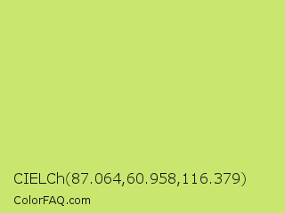 CIELCh 87.064,60.958,116.379 Color is a light lime color and the nearest color is Yellow Green #c5e17a. Hex code #c9e66e and RGB value is rgb(201,230,110). In RGB color space, this color is composed of 79% red, 90% green, 43% blue, In CMYK color space, this color is composed of 13% cyan, 0% magenta, 52% yellow , 10% black , In HSL color space, this color has a hue angle of 75° , 71% saturation and 67% lightness.