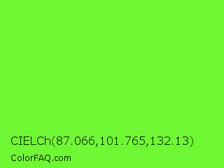 CIELCh 87.066,101.765,132.13 Color is a normal green color and the nearest color is Spring Frost #87ff2a. Hex code #6ff733 and RGB value is rgb(111,247,51). In RGB color space, this color is composed of 44% red, 97% green, 20% blue, In CMYK color space, this color is composed of 55% cyan, 0% magenta, 79% yellow , 3% black , In HSL color space, this color has a hue angle of 102° , 92% saturation and 58% lightness.