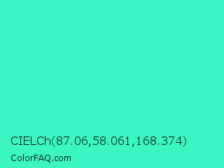 CIELCh 87.06,58.061,168.374 Color is a normal cyan color and the nearest color is Turquoise #40e0d0. Hex code #3bf5c2 and RGB value is rgb(59,245,194). In RGB color space, this color is composed of 23% red, 96% green, 76% blue, In CMYK color space, this color is composed of 76% cyan, 0% magenta, 21% yellow , 4% black , In HSL color space, this color has a hue angle of 164° , 90% saturation and 60% lightness.