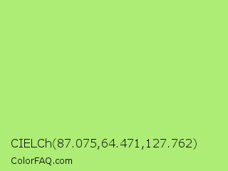 CIELCh 87.075,64.471,127.762 Color is a light green color and the nearest color is Sulu #c1f07c. Hex code #adec75 and RGB value is rgb(173,236,117). In RGB color space, this color is composed of 68% red, 93% green, 46% blue, In CMYK color space, this color is composed of 27% cyan, 0% magenta, 50% yellow , 7% black , In HSL color space, this color has a hue angle of 92° , 76% saturation and 69% lightness.