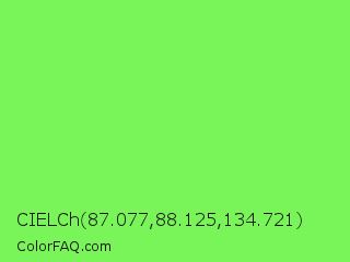 CIELCh 87.077,88.125,134.721 Color is a light green color and the nearest color is Screamin Green #66ff66. Hex code #7af559 and RGB value is rgb(122,245,89). In RGB color space, this color is composed of 48% red, 96% green, 35% blue, In CMYK color space, this color is composed of 50% cyan, 0% magenta, 64% yellow , 4% black , In HSL color space, this color has a hue angle of 107° , 89% saturation and 65% lightness.