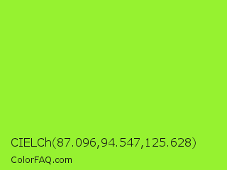 CIELCh 87.096,94.547,125.628 Color is a normal green color and the nearest color is French Lime #9efd38. Hex code #96f230 and RGB value is rgb(150,242,48). In RGB color space, this color is composed of 59% red, 95% green, 19% blue, In CMYK color space, this color is composed of 38% cyan, 0% magenta, 80% yellow , 5% black , In HSL color space, this color has a hue angle of 88° , 88% saturation and 57% lightness.