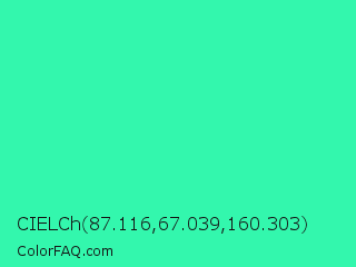 CIELCh 87.116,67.039,160.303 Color is a normal green color and the nearest color is Eucalyptus #44d7a8. Hex code #33f7ad and RGB value is rgb(51,247,173). In RGB color space, this color is composed of 20% red, 97% green, 68% blue, In CMYK color space, this color is composed of 79% cyan, 0% magenta, 30% yellow , 3% black , In HSL color space, this color has a hue angle of 157° , 92% saturation and 58% lightness.