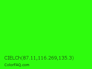 CIELCh 87.11,116.269,135.3 Color is a normal green color and the nearest color is Neon Green #39ff14. Hex code #2efc0d and RGB value is rgb(46,252,13). In RGB color space, this color is composed of 18% red, 99% green, 5% blue, In CMYK color space, this color is composed of 82% cyan, 0% magenta, 95% yellow , 1% black , In HSL color space, this color has a hue angle of 112° , 98% saturation and 52% lightness.