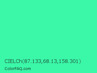 CIELCh 87.133,68.13,158.301 Color is a normal green color and the nearest color is Eucalyptus #44d7a8. Hex code #3bf7a8 and RGB value is rgb(59,247,168). In RGB color space, this color is composed of 23% red, 97% green, 66% blue, In CMYK color space, this color is composed of 76% cyan, 0% magenta, 32% yellow , 3% black , In HSL color space, this color has a hue angle of 155° , 92% saturation and 60% lightness.