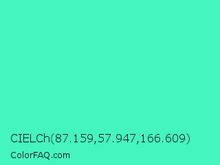 CIELCh 87.159,57.947,166.609 Color is a light green color and the nearest color is Turquoise #40e0d0. Hex code #45f5bf and RGB value is rgb(69,245,191). In RGB color space, this color is composed of 27% red, 96% green, 75% blue, In CMYK color space, this color is composed of 72% cyan, 0% magenta, 22% yellow , 4% black , In HSL color space, this color has a hue angle of 162° , 90% saturation and 62% lightness.