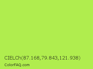 CIELCh 87.168,79.843,121.938 Color is a light green color and the nearest color is Inchworm #b2ec5d. Hex code #b0ed4e and RGB value is rgb(176,237,78). In RGB color space, this color is composed of 69% red, 93% green, 31% blue, In CMYK color space, this color is composed of 26% cyan, 0% magenta, 67% yellow , 7% black , In HSL color space, this color has a hue angle of 83° , 82% saturation and 62% lightness.