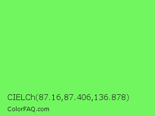 CIELCh 87.16,87.406,136.878 Color is a light green color and the nearest color is Screamin Green #66ff66. Hex code #72f660 and RGB value is rgb(114,246,96). In RGB color space, this color is composed of 45% red, 96% green, 38% blue, In CMYK color space, this color is composed of 54% cyan, 0% magenta, 61% yellow , 4% black , In HSL color space, this color has a hue angle of 113° , 89% saturation and 67% lightness.