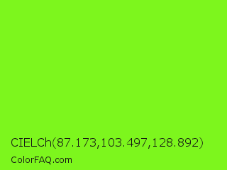 CIELCh 87.173,103.497,128.892 Color is a normal green color and the nearest color is Spring Frost #87ff2a. Hex code #7df61d and RGB value is rgb(125,246,29). In RGB color space, this color is composed of 49% red, 96% green, 11% blue, In CMYK color space, this color is composed of 49% cyan, 0% magenta, 88% yellow , 4% black , In HSL color space, this color has a hue angle of 93° , 92% saturation and 54% lightness.