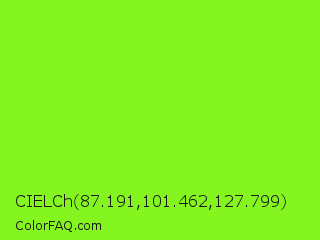 CIELCh 87.191,101.462,127.799 Color is a normal green color and the nearest color is Spring Frost #87ff2a. Hex code #85f520 and RGB value is rgb(133,245,32). In RGB color space, this color is composed of 52% red, 96% green, 13% blue, In CMYK color space, this color is composed of 46% cyan, 0% magenta, 87% yellow , 4% black , In HSL color space, this color has a hue angle of 92° , 91% saturation and 54% lightness.