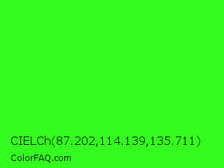 CIELCh 87.202,114.139,135.711 Color is a normal green color and the nearest color is Neon Green #39ff14. Hex code #33fc1e and RGB value is rgb(51,252,30). In RGB color space, this color is composed of 20% red, 99% green, 12% blue, In CMYK color space, this color is composed of 80% cyan, 0% magenta, 88% yellow , 1% black , In HSL color space, this color has a hue angle of 114° , 97% saturation and 55% lightness.