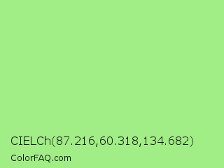 CIELCh 87.216,60.318,134.682 Color is a light green color and the nearest color is Feijoa #9fdd8c. Hex code #a1ee86 and RGB value is rgb(161,238,134). In RGB color space, this color is composed of 63% red, 93% green, 53% blue, In CMYK color space, this color is composed of 32% cyan, 0% magenta, 44% yellow , 7% black , In HSL color space, this color has a hue angle of 104° , 75% saturation and 73% lightness.