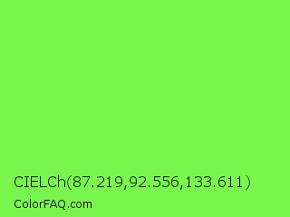 CIELCh 87.219,92.556,133.611 Color is a light green color and the nearest color is Screamin Green #66ff66. Hex code #78f64e and RGB value is rgb(120,246,78). In RGB color space, this color is composed of 47% red, 96% green, 31% blue, In CMYK color space, this color is composed of 51% cyan, 0% magenta, 68% yellow , 4% black , In HSL color space, this color has a hue angle of 105° , 90% saturation and 64% lightness.
