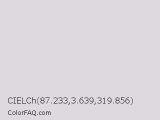 CIELCh 87.233,3.639,319.856 Color is a very light purple color and the nearest color is Gainsboro #dcdcdc. Hex code #ded9df and RGB value is rgb(222,217,223). In RGB color space, this color is composed of 87% red, 85% green, 87% blue, In CMYK color space, this color is composed of 0% cyan, 3% magenta, 0% yellow , 13% black , In HSL color space, this color has a hue angle of 290° , 9% saturation and 86% lightness.