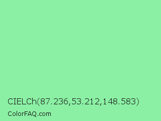 CIELCh 87.236,53.212,148.583 Color is a light green color and the nearest color is Light Green #90ee90. Hex code #8bf0a4 and RGB value is rgb(139,240,164). In RGB color space, this color is composed of 55% red, 94% green, 64% blue, In CMYK color space, this color is composed of 42% cyan, 0% magenta, 32% yellow , 6% black , In HSL color space, this color has a hue angle of 135° , 77% saturation and 74% lightness.