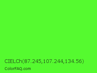 CIELCh 87.245,107.244,134.56 Color is a normal green color and the nearest color is Neon Green #39ff14. Hex code #55fa2f and RGB value is rgb(85,250,47). In RGB color space, this color is composed of 33% red, 98% green, 18% blue, In CMYK color space, this color is composed of 66% cyan, 0% magenta, 81% yellow , 2% black , In HSL color space, this color has a hue angle of 109° , 95% saturation and 58% lightness.