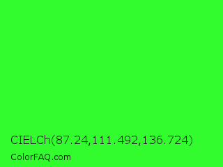 CIELCh 87.24,111.492,136.724 Color is a normal green color and the nearest color is Neon Green #39ff14. Hex code #32fc2e and RGB value is rgb(50,252,46). In RGB color space, this color is composed of 20% red, 99% green, 18% blue, In CMYK color space, this color is composed of 80% cyan, 0% magenta, 82% yellow , 1% black , In HSL color space, this color has a hue angle of 119° , 97% saturation and 58% lightness.