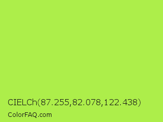 CIELCh 87.255,82.078,122.438 Color is a light green color and the nearest color is Conifer #acdd4d. Hex code #adee4a and RGB value is rgb(173,238,74). In RGB color space, this color is composed of 68% red, 93% green, 29% blue, In CMYK color space, this color is composed of 27% cyan, 0% magenta, 69% yellow , 7% black , In HSL color space, this color has a hue angle of 84° , 83% saturation and 61% lightness.